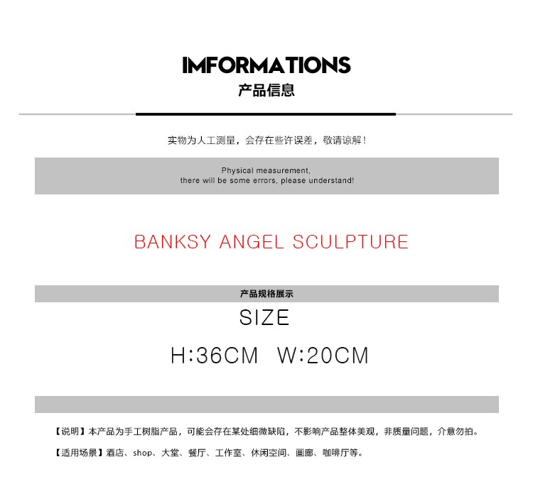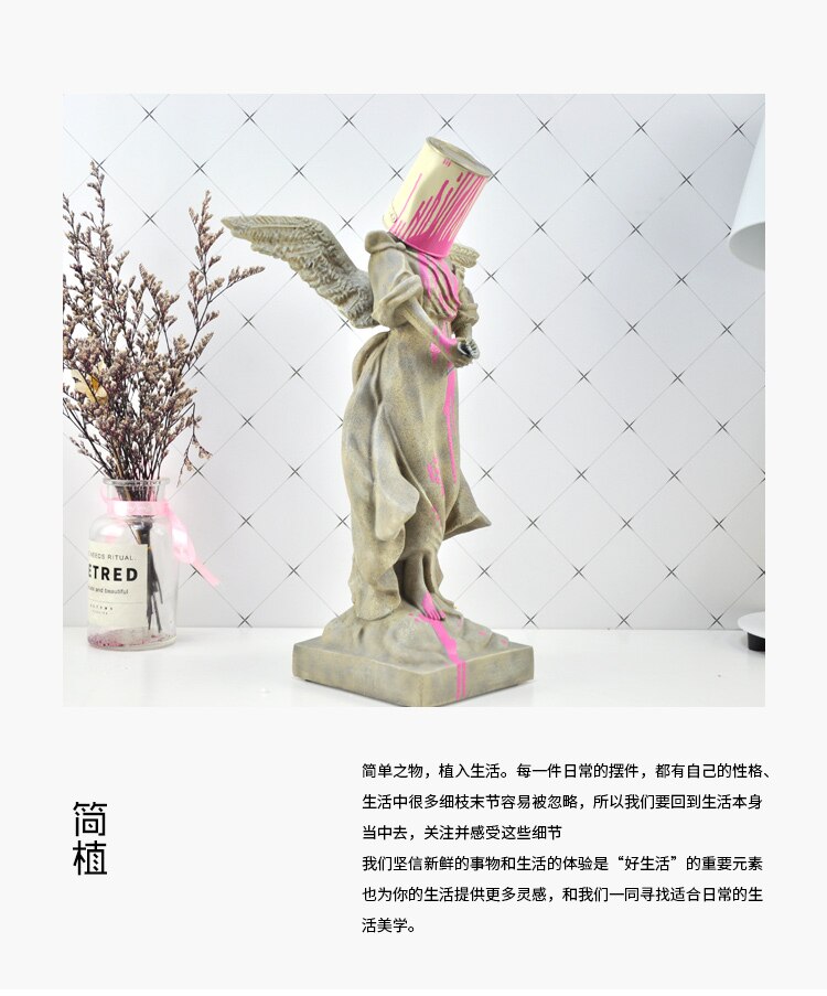 Introducing our Banksy Angel Street Art Resin Sculpture Full-length Portrait Iron Paint Bucket Action Figure Toy. This unique piece is a striking embodiment of urban street art and a testament to the creativity of world-renowned artist Banksy.